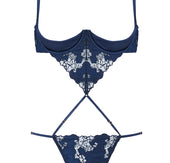 Every element has been meticulously designed. The soft cup shape, the bespoke embroidery of rich navy cascading in panels across the body, and the tactile teardrop cut out at the heart of the chest begins the enthralling experience of the piece.
