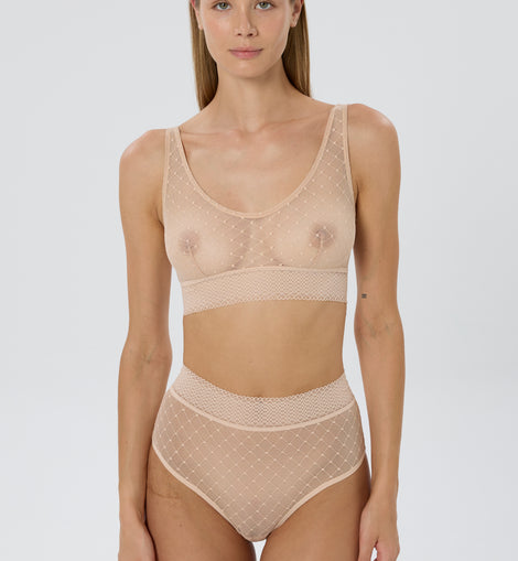 Rendered in sexy fishnet-inspired lace, the Cosmo High Waisted Brief captures old-world glamour in its sultriest form. The wide, extra-soft waistband gives just enough support, while the sheer lace’s darkly glamorous effect ensures its star status in the lingerie drawer.