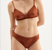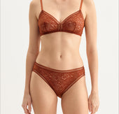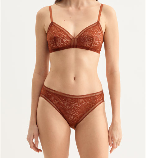Finished with a graphic lace trim, the Suave briefs come in Leavers lace with a fruity pattern.