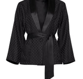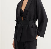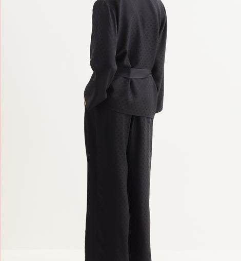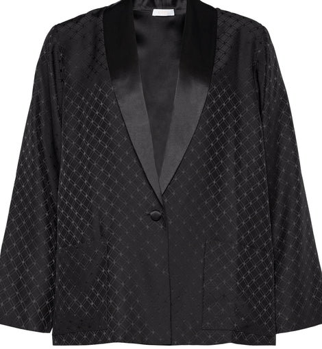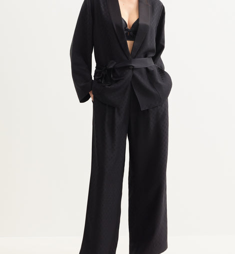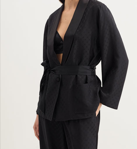A statement piece, the Velours jacket is made of silk jacquard with matte and shiny diamonds. Its detachable belt adds comfort and practicality.