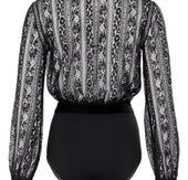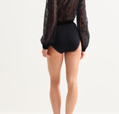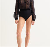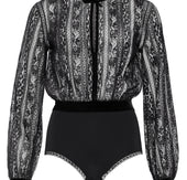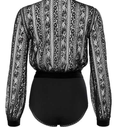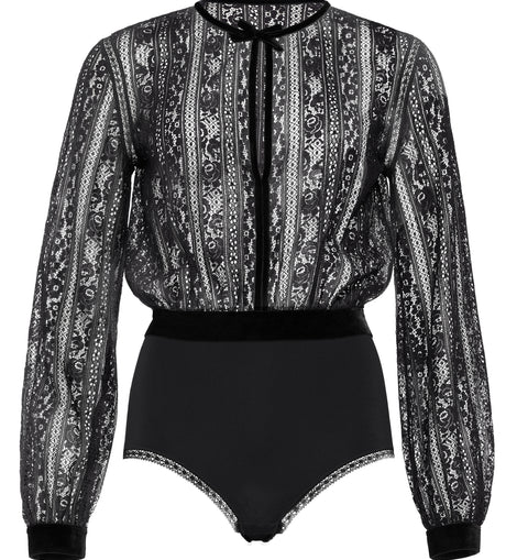 Featuring velvet details at the cuffs, neckline and waist, Leavers lace and the Maison's signature Jersey Soyeux, the Voltige bodysuit offers comfort and femininity.