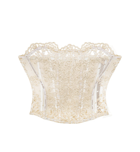The Royal Jewel Strapless Bustier in cream gold combines sculpted elegance with versatility, crafted to be styled effortlessly as both intimate wear and a chic standalone top. The design exudes sophistication, allowing for endless expressions of refined glamour.