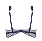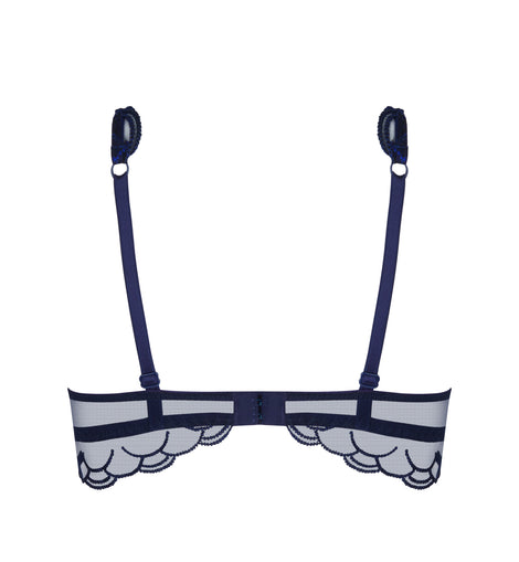 Upper cup in scalloped embroidery, lower cup in satin knit, center front in sheer tulle. Basque in tulle with an embroidered scalloped band.