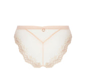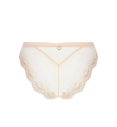 Front in embroidered fabric, scalloped embroidery along the front and back thigh edges. Back triangle in tulle. Elastic tulle band at the waist with jeweled rings at the center back.