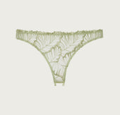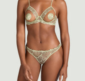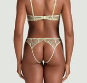 Turning around, the shimmering embroidery extends over the top of the derrière, meeting smooth silk straps to frame the open silhouette that entices the eye and heightens the senses.