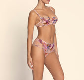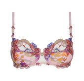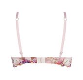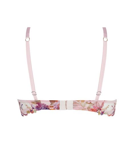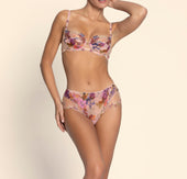 Upper cup in multicolored scalloped embroidery inlaid on printed fabric. Lower cup in printed tulle. Basque in tulle with multicolored embroidery and printed tulle. Center gore in tulle with jewel detail and small floral embroidery motifs on the straps and at the lower center gore.