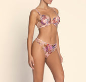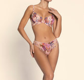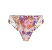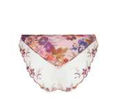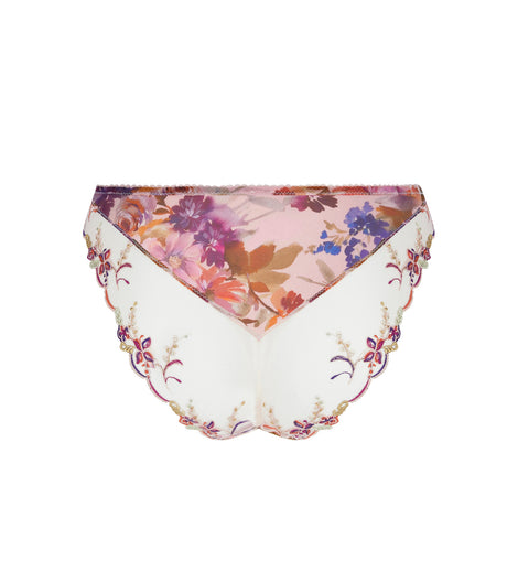 Front and upper back in printed tulle, front lined. Front and back leg openings in multicolored scalloped embroidery. Fancy waistband elastic.