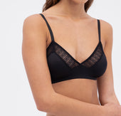 The Matrix Underwire Soft Triangle Bra is a seductive hybrid of graphic modernity and silky comfort. Exceptionally soft microfiber fabric (as used in our beloved Nano collection) creates a smooth foundation, while a new sustainable lace artfully plays with linear geometries.