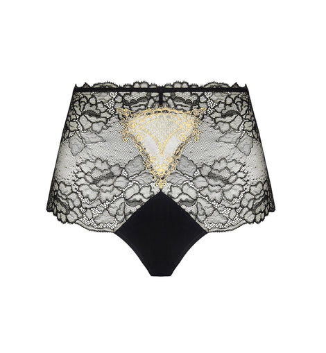 Entirely crafted in wide scalloped Calais Leavers lace trim, top and bottom. Laminated embroidered motif at the front center. Tulle triangle at the back.