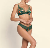 Front in printed silk, adorned with a fine rhinestone elastic strap. The sides and back are in lace matching the print, while the center back features a tulle triangle decorated with delicate embroidered motifs.