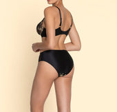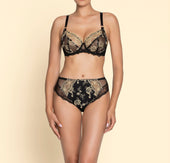 Triangle underwire cup with plunge effect to enhance and sexy look. Cups in laminated embroidery on tulle. Full high basque in Calais Leavers lace. Upper center gore in tulle with a rhinestone motif. Gold-tone metal rings on the straps.