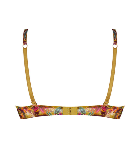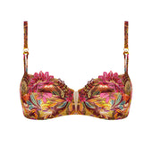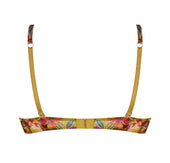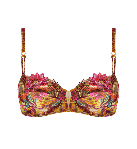 The cups and frame are crafted from printed tulle. The neckline is adorned with scalloped multicolor embroidery inset for an elegant decorative finish. The front straps feature printed tulle spaghetti straps accented with gold-tone jewels. The center front is in printed fabric with a sheer tulle cutout embellished with rhinestones for a refined touch of sparkle.