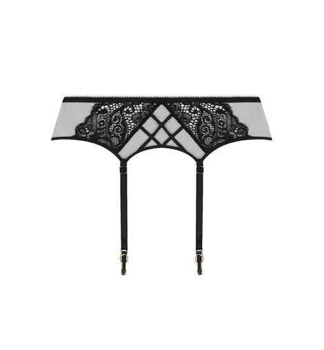 The garter belt features an elegant crisscross design of satin-finish elastic ribbons at the front, framed by refined lace. The back is crafted from tulle and lace, with coordinating ribbon details that provide both structure and support for an elegant finish.
