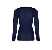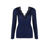 Long-sleeve top in tubular knit with glitter guipure trim at the V-neckline.