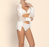 Underwear that subtly reveals the curves and ensures perfect invisibility under garments. Front in embroidered fabric, scalloped embroidery along the front and back thigh edges. Back triangle in tulle. Elastic tulle band at the waist with jeweled rings at the center back.
