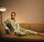 Pale yellow silk satin comes alive with our playful can-can motifs, capturing the energy of Parisian celebration. The Lila Loulou pajama is tailored for a relaxed fit, perfect for entertaining or stylish evenings at home.