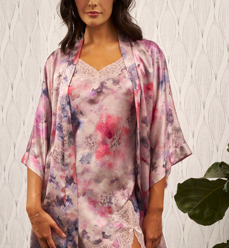 The kimono style robe is elegant, feminine and sensual. The heavy weight silk charmeuse has a soft touch and luxurious feel to the bare skin. It can be worn worn all year round.