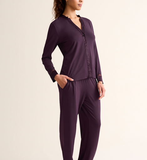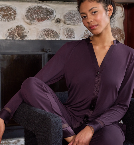 When we say, ‘get your beauty sleep’, we mean slip on this luxurious PJ set. Enjoy the stylish mesh details, ultra-soft modal fabric, and satin drawstring. Features: - Soft stretch mesh details - Button-down top - Satin drawstring - High quality satin charmeuse - Top and pant included - TENCEL™ Modal - Micro fibers - Ethically made Washing Instructions: - Hand wash, cold water OR machine wash closed in mesh bag, gentle cycle - Hang to dry