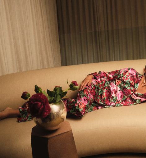 Rendered in luminous red silk satin, the Moulin print blooms with painterly florals that evoke the richly layered wallpapers of Parisian salons. Our beloved Lila pajama silhouette balances relaxed comfort with refined style. Designed for the party and after-party, it celebrates elevated at-home dressing.