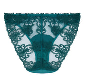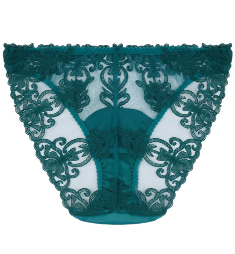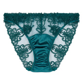 A refined bestselling style, this luxury brief balances opulence with everyday comfort and wearability. The flattering mid-rise silhouette is elegant with good coverage and combines sheer tulle and embroidery with a luxurious front silk panel in an irresistible shade of peacock green.