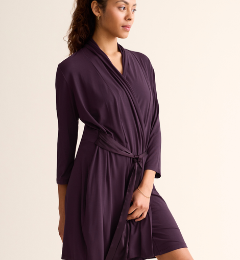 The iconic Fleur’t robe is perfect for peaceful mornings, relaxing afternoons, and cozy evenings. Luxurious satin ties, pockets on either side, a flattering ruched waist at the back, and cloud-soft, eco-friendly fabric make this robe the perfect addition to your loungewear wardrobe. Best worn over your favorite Fleur’t sleepwear… or over nothing at all. Features - TENCEL™ Modal - Micro fibers - Inset belt and internal drawstring - Draped with ¾ sleeves - Ruched back - Pockets
