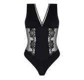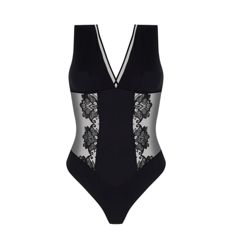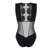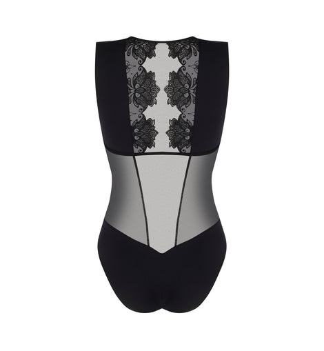 Bodysuit with underbust support reinforced by elastic. The neckline is trimmed with crystal tulle bordered by satin-finish elastic. Soft mesh cups are lined with supportive tulle and fitted with wide straps. The front features mesh with embroidered side insets, extending into tulle panels at the back. The lower front and back are in lined mesh with a three-row hook-and-eye gusset. The upper back is in embroidered crystal tulle for a delicate open-back effect.