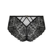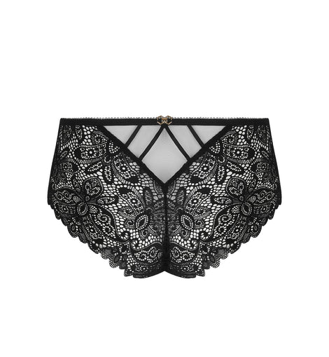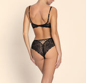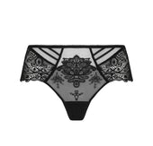 This shorty features scalloped embroidery set into crystal tulle at the front. Its structure is defined by two lightweight triangular panels, highlighted by parallel elastic ribbons along the waist on the sides. The thighs, both front and back, are crafted in lace coordinated with the embroidery for a beautifully harmonious look. At the center back, a crystal tulle triangle is topped with fine elastic ribbons that provide both structure and support. A delicate jewel at the waist completes the design with an elegant finishing touch.