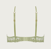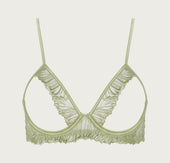 Soft silk straps encircle the bust with soft precision, while delicate scalloped edges guide the gaze with elegant intent to the décolletage, tracing the contours of the bust in an open silhouette. Luminous pistachio enhances the delicate detailing with fitting radiance. The open design balances bold exposure with sculpted contouring, inviting touch and admiration with a sensuous, deliberate grace and celebrating the body in its most intimate, artful form.