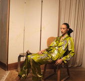 Jewel-collared leopard motifs animate golden green silk satin in the Chanson print, bringing playful drama to at-home dressing. Our relaxed Lila pajama silhouette moves effortlessly from party to after-party, embodying the spirit of Parisian soirées.