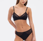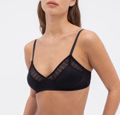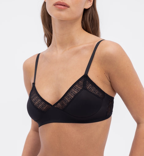 The Matrix Underwire Soft Triangle Bra is a seductive hybrid of graphic modernity and silky comfort. Exceptionally soft microfiber fabric (as used in our beloved Nano collection) creates a smooth foundation, while a new sustainable lace artfully plays with linear geometries.