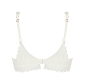 The upper cup is crafted from embroidered organza lace trim, while the lower cup features embroidered organza lace. The frame and back inset are made of jacquard lace trim. The front strap is a delicate split spaghetti strap adorned with an organza bow. The center front features a sheer invisible tulle cutout over lace, embellished with a gold-tone rhinestone jewel. Rings and adjusters are finished in gold-tone metal.